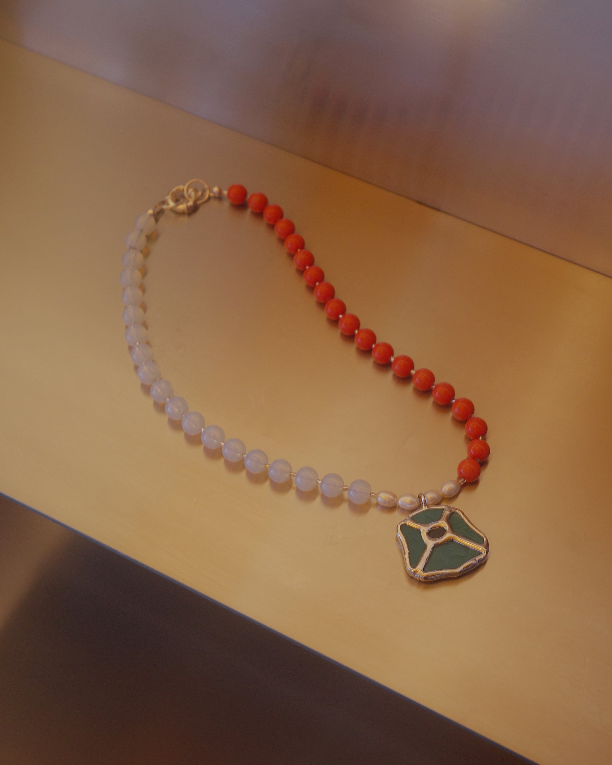 Stained glass poppy pendant on beaded necklace with sterling silver closure.