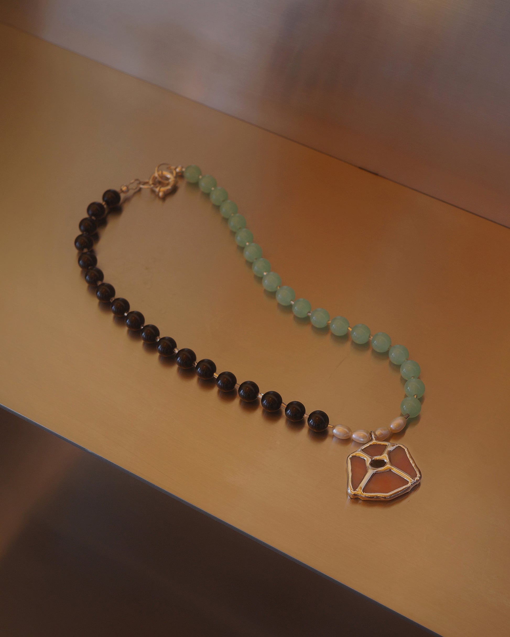 Stained glass poppy pendant on beaded necklace with sterling silver closure.