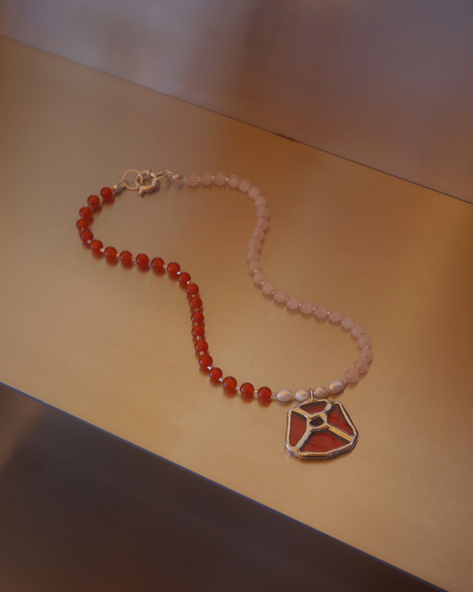 Stained glass poppy pendant on beaded necklace with sterling silver closure.